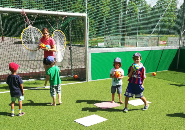 Die Leiter der Ballschule im ASV Martinszell, Tanja und Thomas Stalder haben die Kinder aus dem Kindergarten in Oberdorf zu einem Schnuppertraining auf dem Soccerplatz eingeladen.